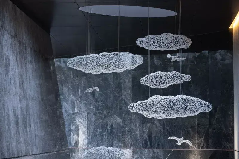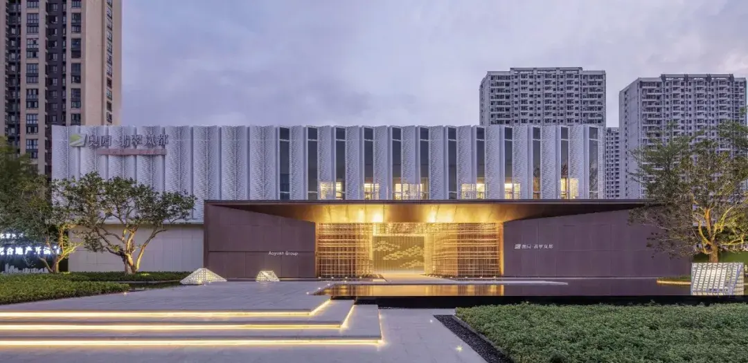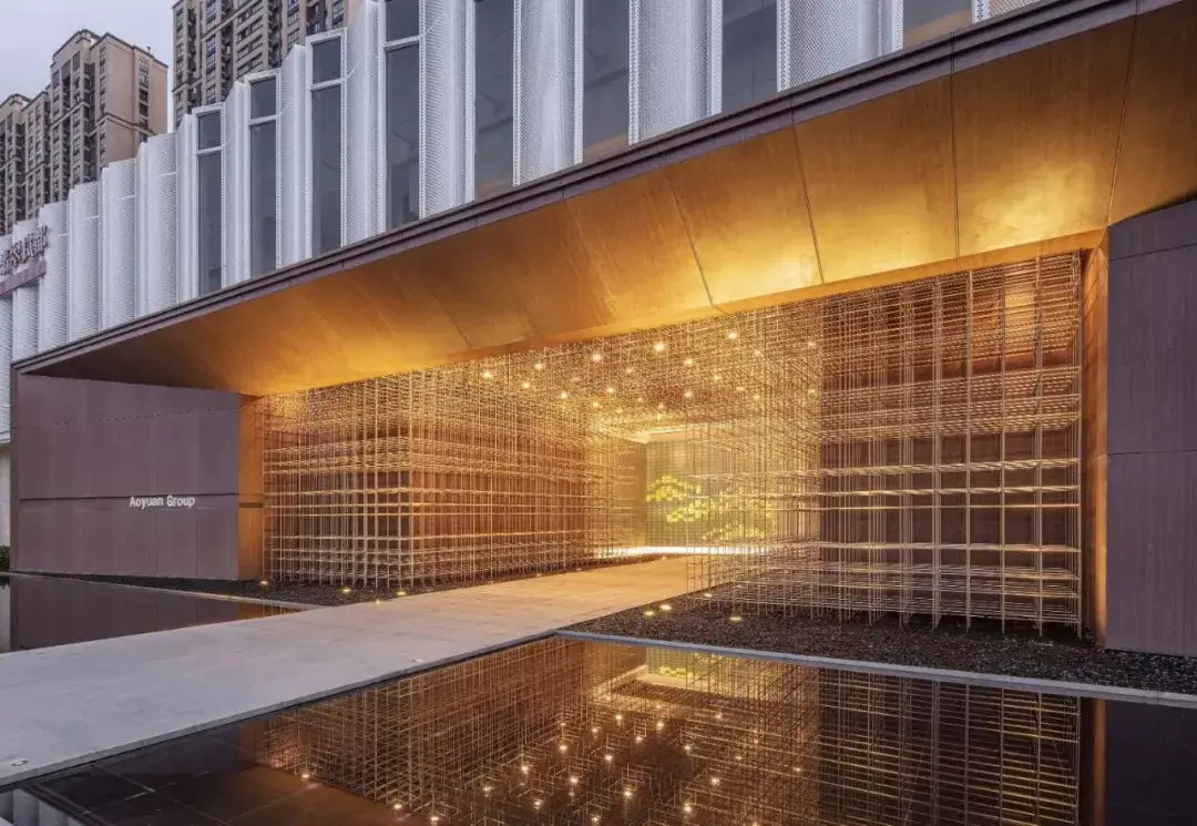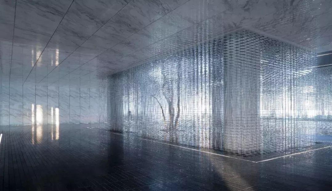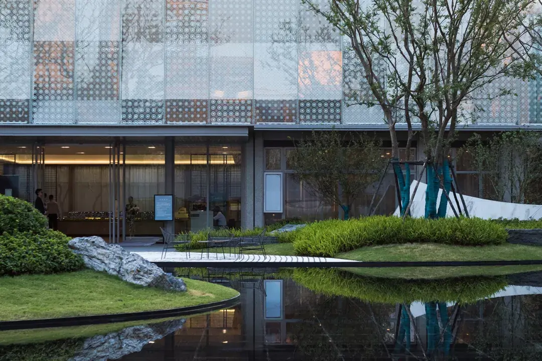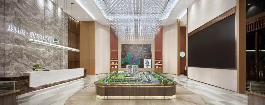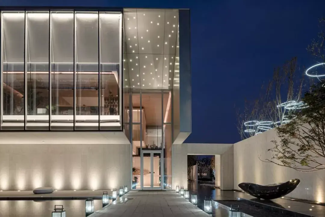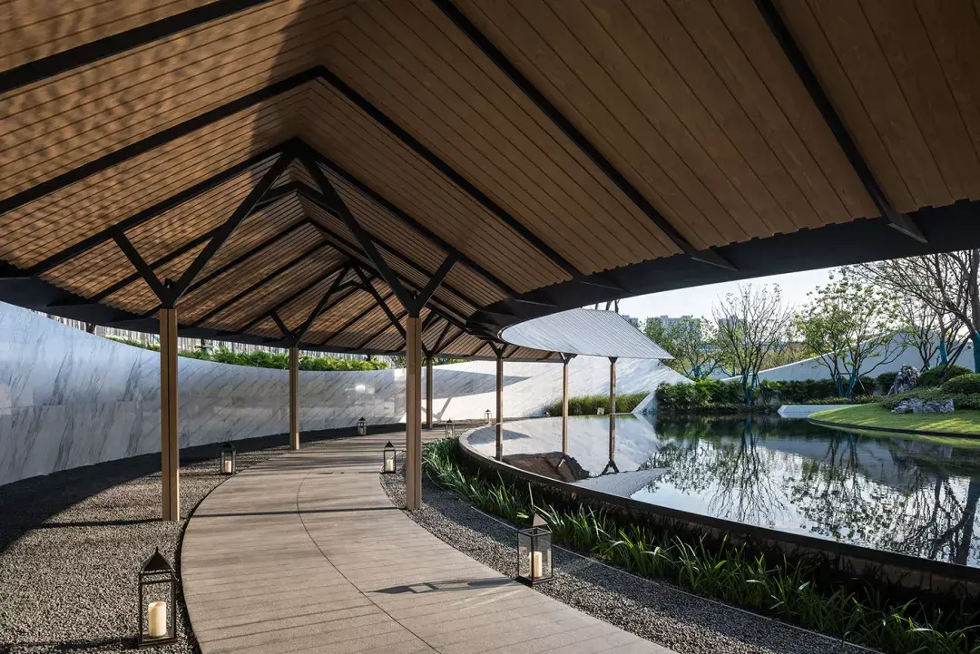 项目设计挖掘历史文化元素并融入场地,打造现代与传统相交融,具有时尚、艺术感的品质住宅。灰空间内悬挂艺术雕塑,光影交错变化,优雅古典的厚重感与简约凝练的现代感无限交融,于现代风格中展现精巧微妙的东方韵味。