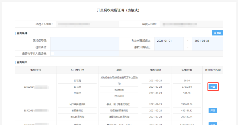 在查询结果,选择需要开具的税票信息,点击【开具】按钮。