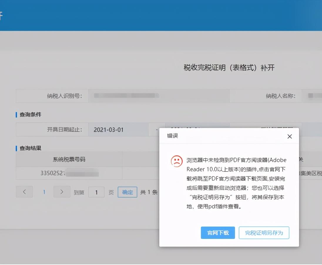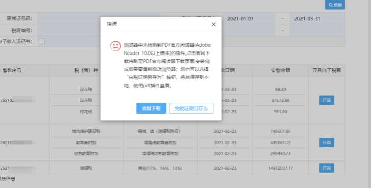 若需要直接打开完税证明,需安装PDF官方阅读器(Adobe Reader 10.0以上版本),可点击【官网下载】下载阅读器。用户亦可不安装软件直接将【完税证明另存为】保存到电脑本地,自行查看或打印。
