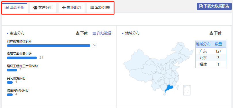 聚法案例的律师分析平台涵盖了全国95%以上的律师执业信息,结合海量的裁判文书,对每位律师进行多维度数据挖掘,包括基础分析、客户分析、执业能力、案例列表四大模块,以可视化图表的形式直观展示律师的案件数量、案件类型、胜败诉率、判决金额等信息。利于当事人对律师职业能力进行判断。