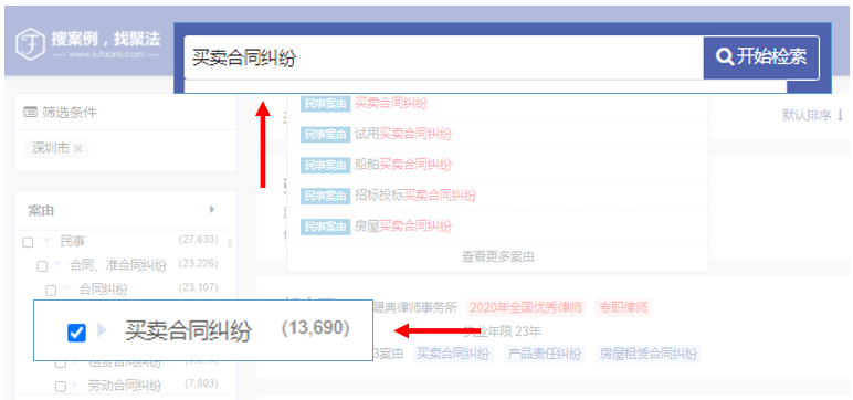 第二步:在结果列表页面,输入关键词“买卖合同纠纷”或者勾选左侧筛选条件“买卖合同纠纷”案由,点击“在结果中搜索”。