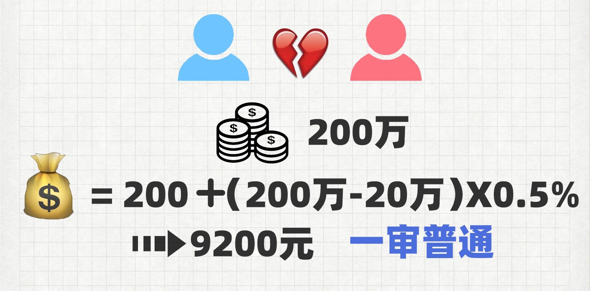 回到我们前面的例子中,如果小蓝和小红,是先离完婚,再起诉分割200万共同财产的。那么案件受理费就需要2.3万元左右了。