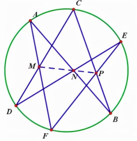 “帕斯卡六边形定理”:如果一个六边形内接于一条二次曲线(圆、椭圆、双曲线、抛物线),那么它的三对对边的交点在同一条直线上。