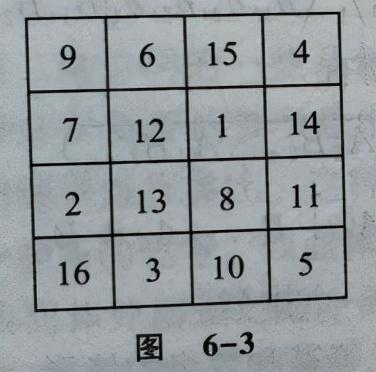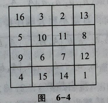 每行每列对角线之和都为34,而且随便画一个正方形,四角上的四个数的和也都为34。更为神奇的是把行(或列)移到另一边上,所得正方向排列仍是一个幻方,如图6-4。