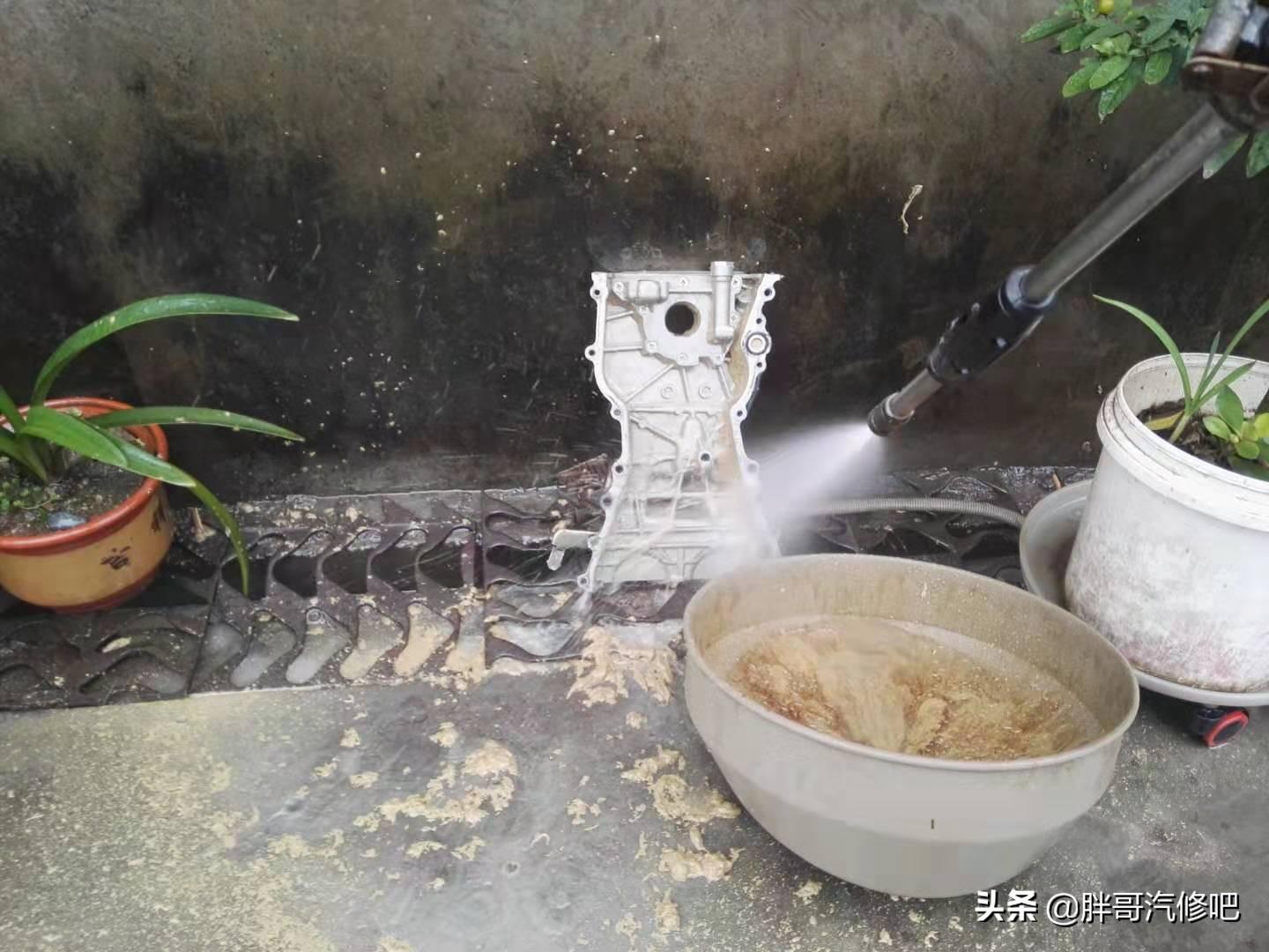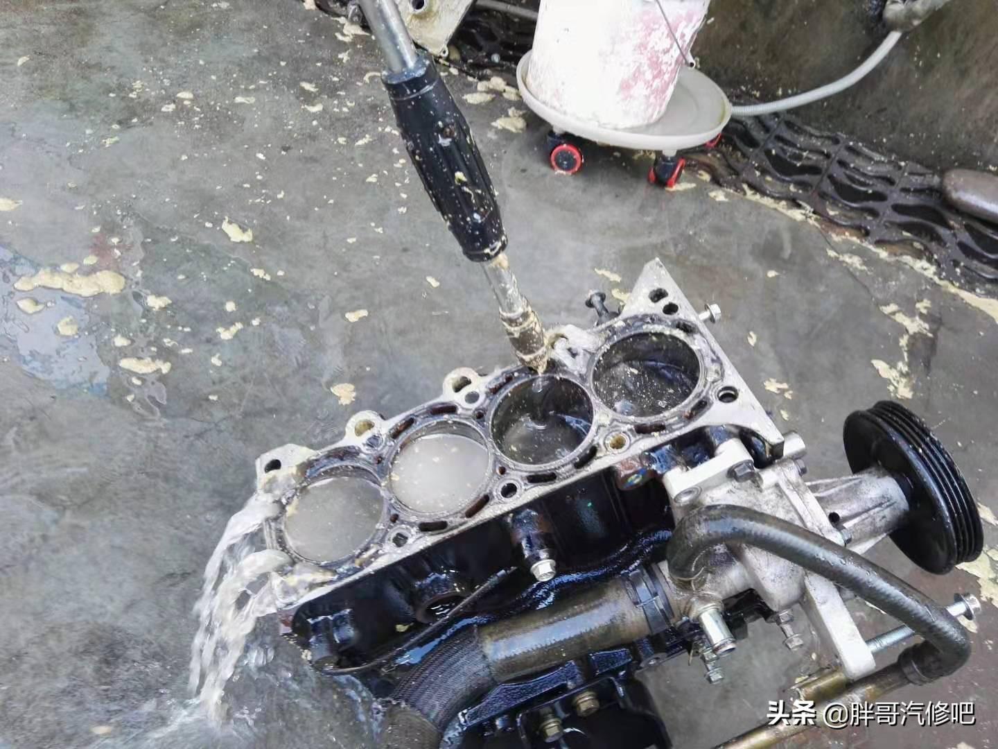 大家注意看,1缸的水道和水堵相通,胖哥用气枪一吹里面的机油乳化物就出来了。