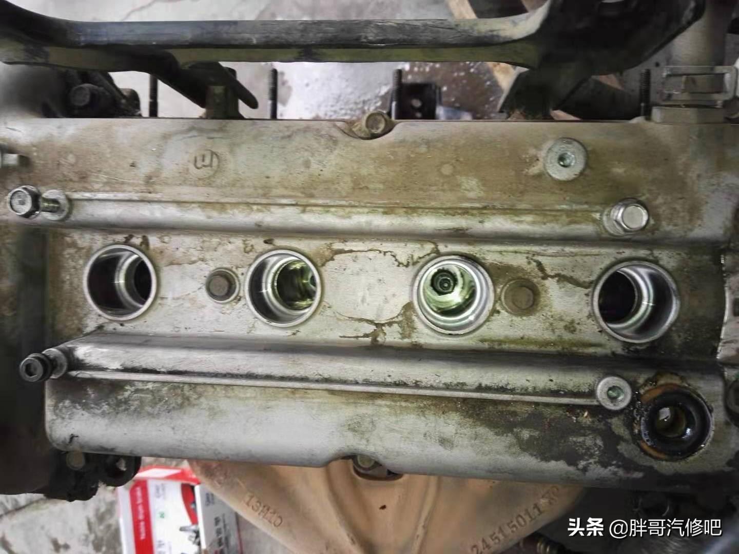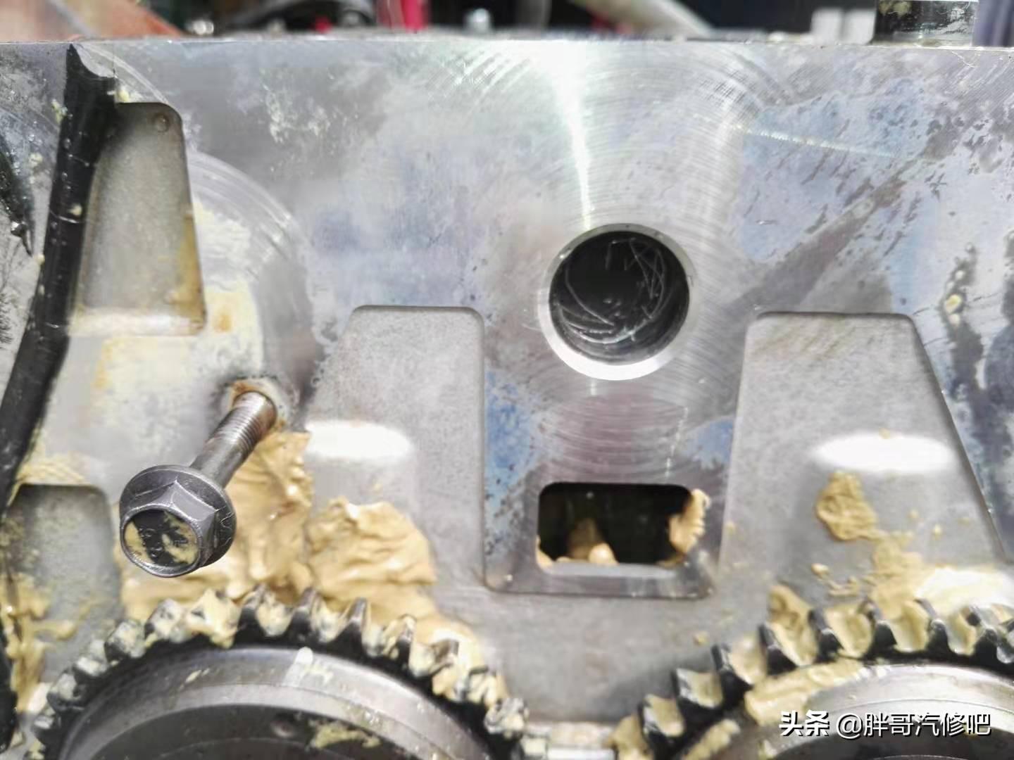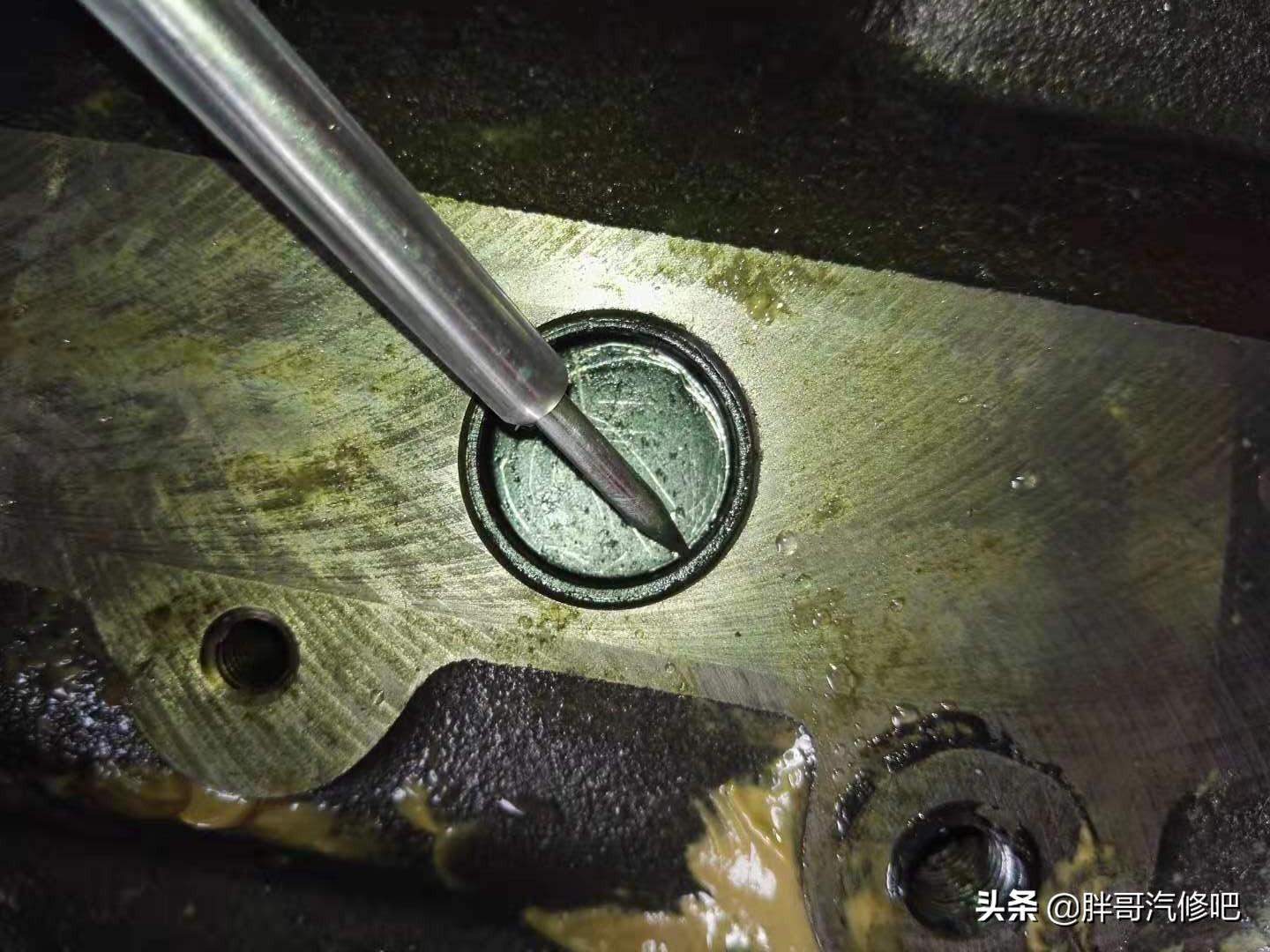 水堵边缘轻轻一桶就破了几个小洞。这个水堵刚好位于正时链条处。