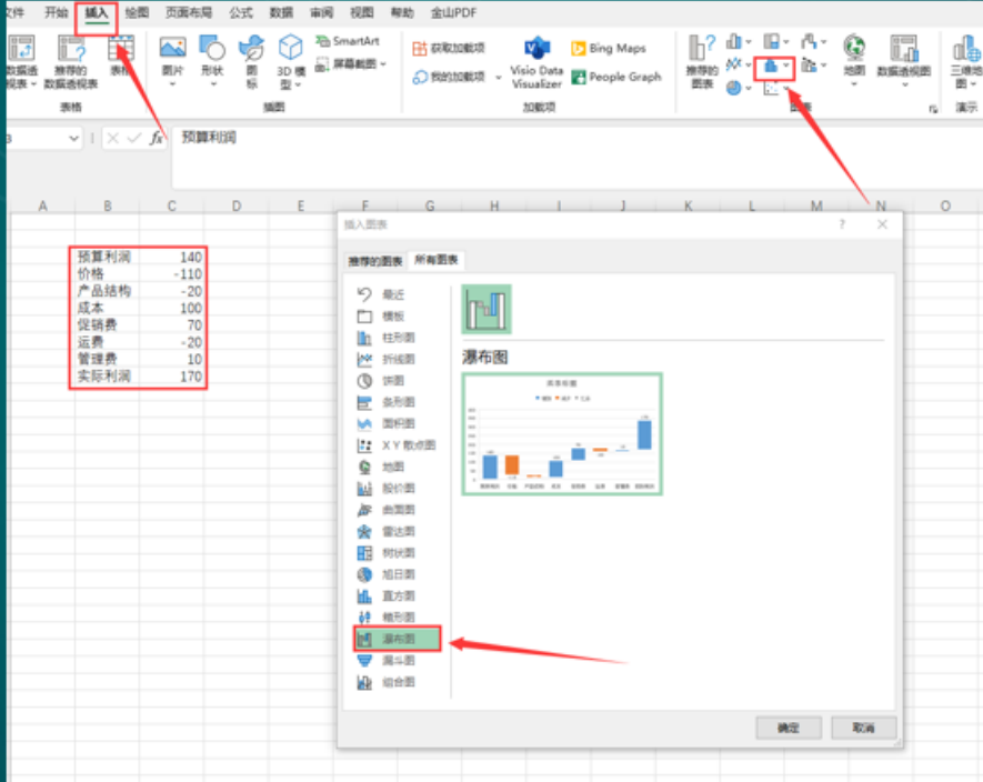 插入瀑布图的方式