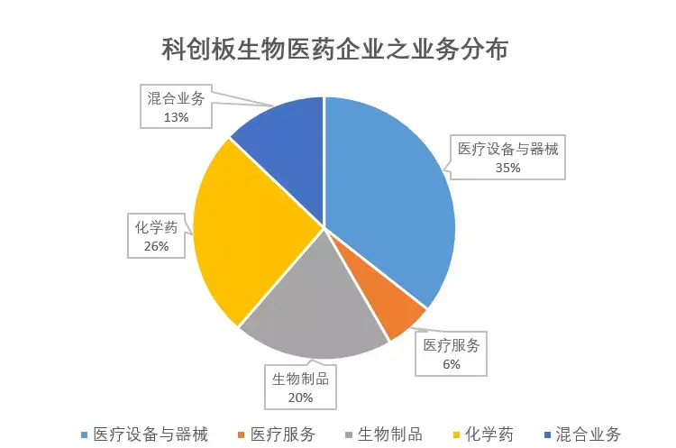 根据《上海证券交易所科创板企业发行上市申报及推荐暂行规定(2021年4月修订)》第四条的规定,生物医药领域主要可以细分为四大块:生物制品、高端化学药、高端医疗设备与器械及相关技术服务。参考此种分类,已申报科创板的132家生物医药企业的业务分布如下图所示: