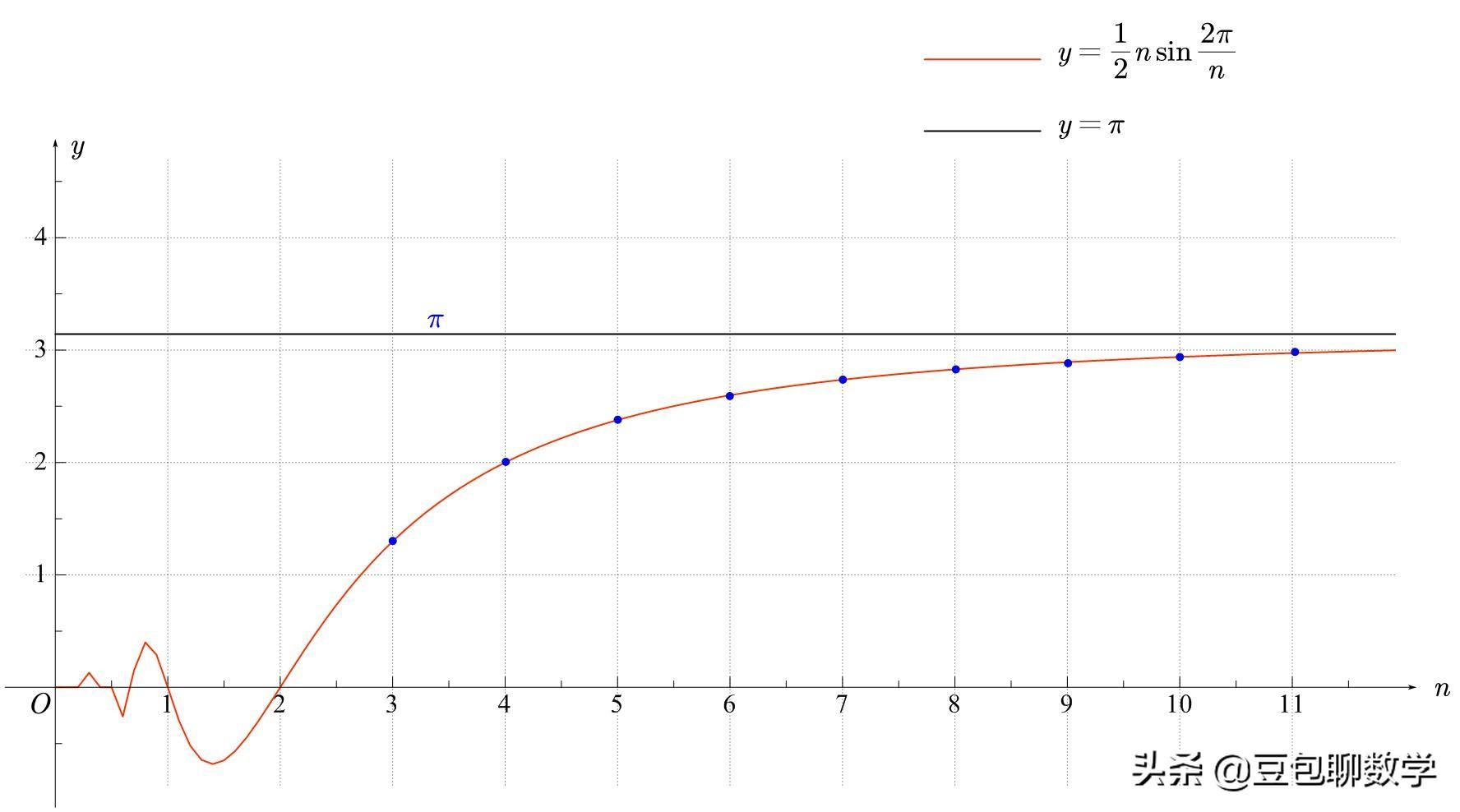 当半径r=1时,我们做出正多边形面积函数的图像。