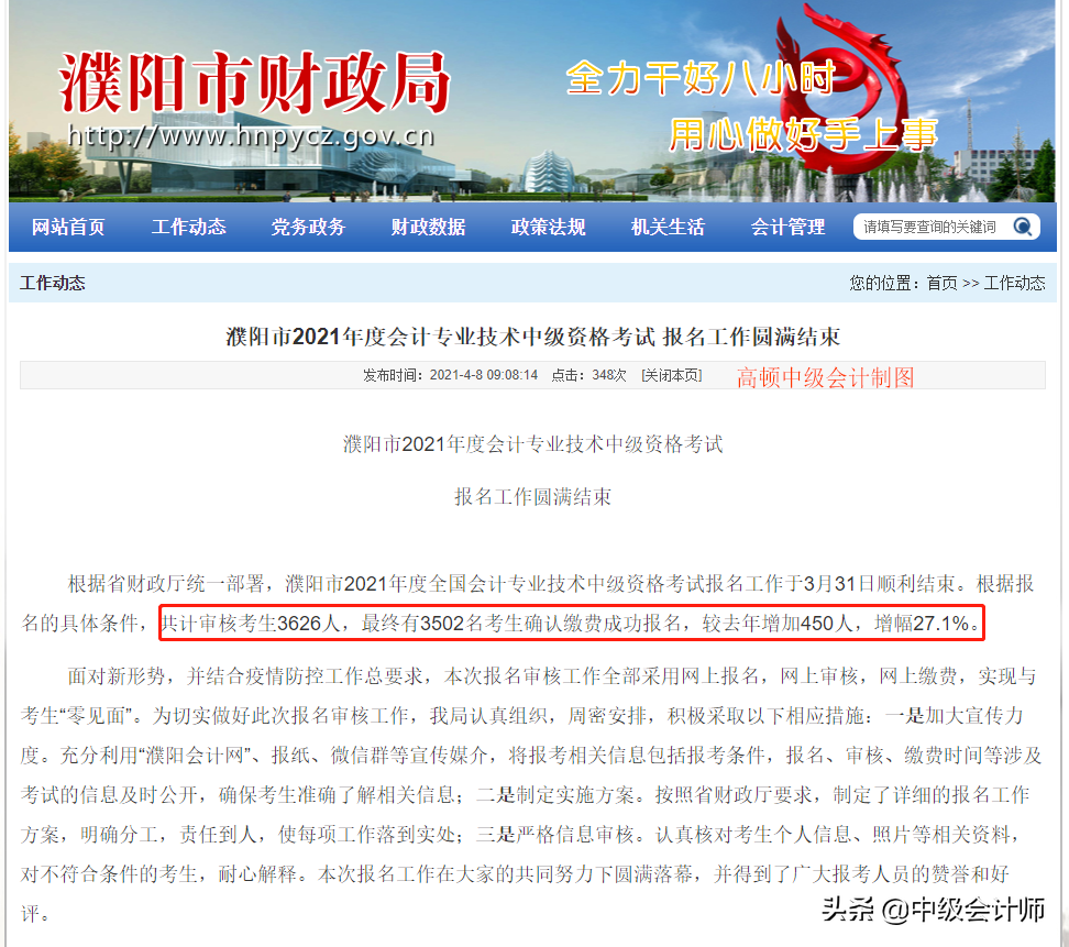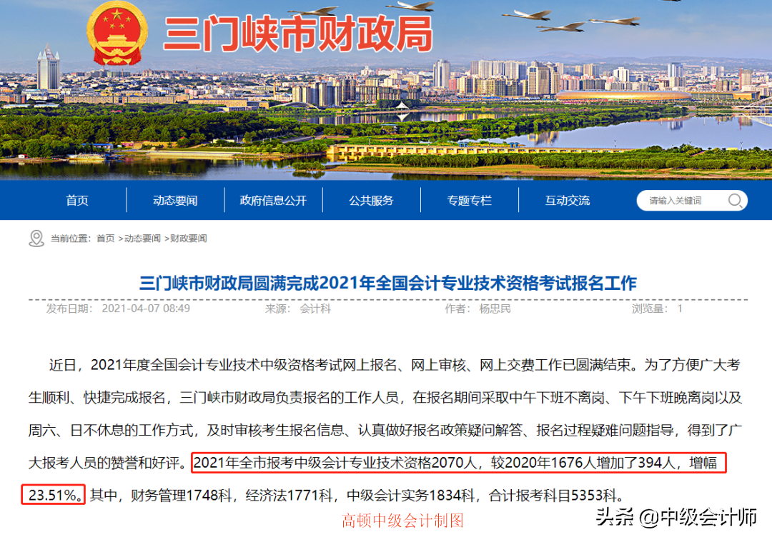 2021年中级会计报名人数3626人,审核成功的人数为3502人,较2020年增加450人,增幅达到了27.1%!