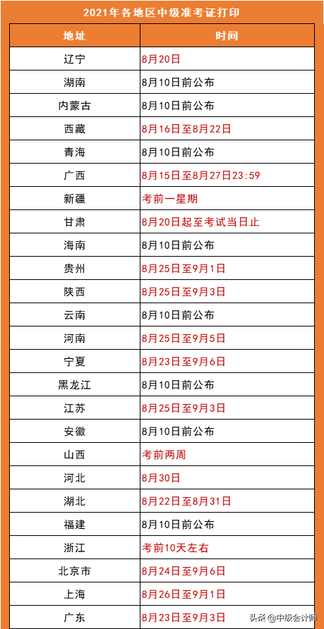 根据财政部公布的《关于2021年度全国会计专业技术中级资格考试日程安排及有关事项的公告》,8月10日前,各省级考试管理机构公布本地区中级会计资格考试准考证网上打印的起止时间,请考生加以关注!