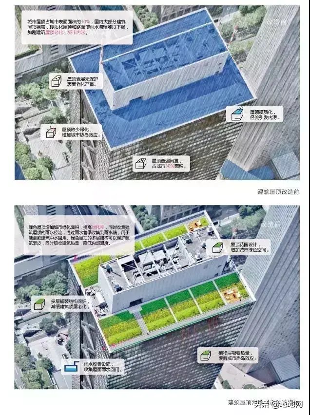 绿色屋顶策略中,表面种植绿色植被,用以吸收雨洪期间多余的雨水径流,通过植物根系净化过滤,将雨水收集到雨水桶进行存储回用;绿色屋顶底层有轻质土层、防根系穿透层、排水层以及防水层等多层结构保护,同时能保护建筑表层,多样植物搭配的绿色植被层可以吸收建筑热量,缓解城市热岛效应。