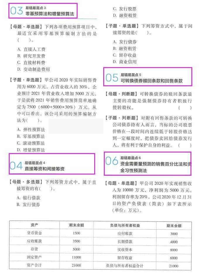 (2)零基础预算法和增量预算法;直接筹资和间接筹资;可转换债券赎回条款和回售条款;资金需要量预测的销售百分比法和资金习性预测法