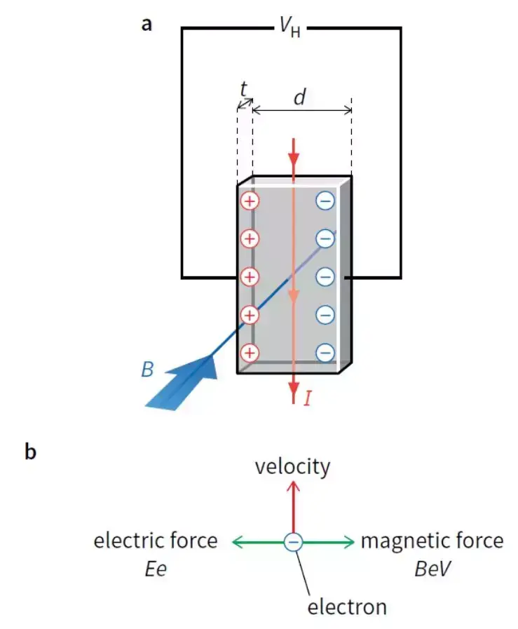图丨霍尔效应 a.向通电导体加以垂直于电流方向的磁场,能使得电荷运动发生偏转,在导体左右侧堆积电荷从而产生霍尔电压 VH;b.电子处于磁场和霍尔电压作用下的受力分析。(来源:英国 ALevel-Physics 课本)