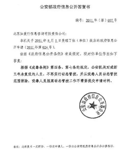 2011年8月,一家开展艾滋病防治工作和人权保护的民间公益组织就《戒毒条例》中戒断人员如何脱离动态管控向公安部申请政府信息公开。申请的内容有三项: