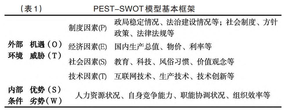 宏观环境分析主要考察主体发展的外部环境,态势分析既考察主体的自身条件(优势和劣势),也考察其外部环境(机遇和威胁),二者具有相通之处。本文将二者相结合起来,构建起PEST-SWOT复合矩阵分析框架(如表1)。机遇与威胁两大外部战略分析运用PEST结构,着重分析制度、经济、社会、技术四类社会环境影响因素。其中优势与劣势两大内部战略分析聚焦地区自身环境,并深入分析支持项目建设的地区实际建设条件[4]。