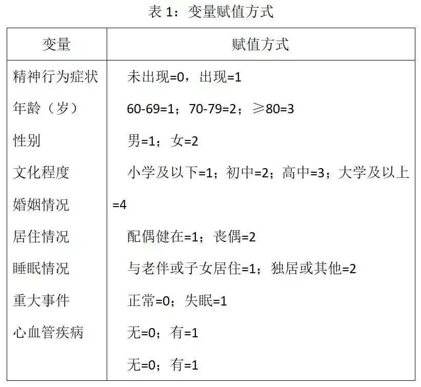 看过的朋友应该记得,我们之前讲过这个案例,当时是以患者精神行为症状个数的分组为因变量进行的有序多分类logistic回归(案例分析 | 有序多分类logistic回归及SPSS操作),如果我们改变指标,将结局定为出现精神行为症状和未出现精神行为症状,此时因变量是一个二分类资料,那么对于该问题的研究就不能再使用有序多分类logistic回归,而是运用它专属的二分类logistic回归。各变量赋值方式如表1: