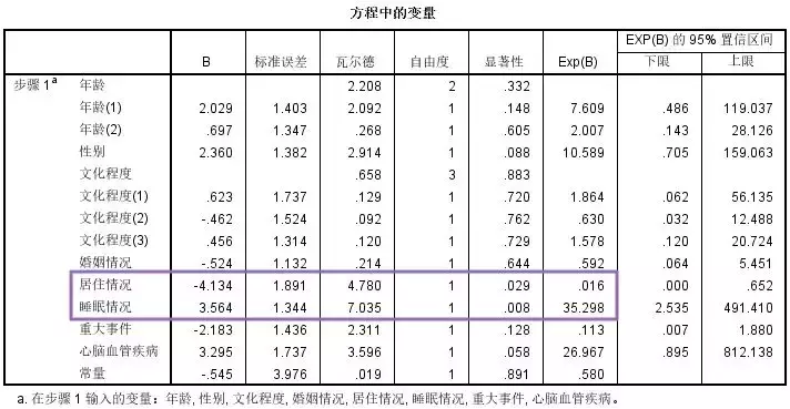 由表格可以看出,居住情况和睡眠情况2个变量对患者精神行为的症状的影响有统计学意义。其中Exp(B)(OR值)的含义为:相对于赋值较低的研究对象,赋值较高的研究对象出现精神行为症状的风险为多少。结果显示:与老伴和子女居住的患者比独居的患者更易出现精神行为症状(OR=0.016);失眠的患者比睡眠正常的患者更易出现精神行为症状(OR=35.298)。