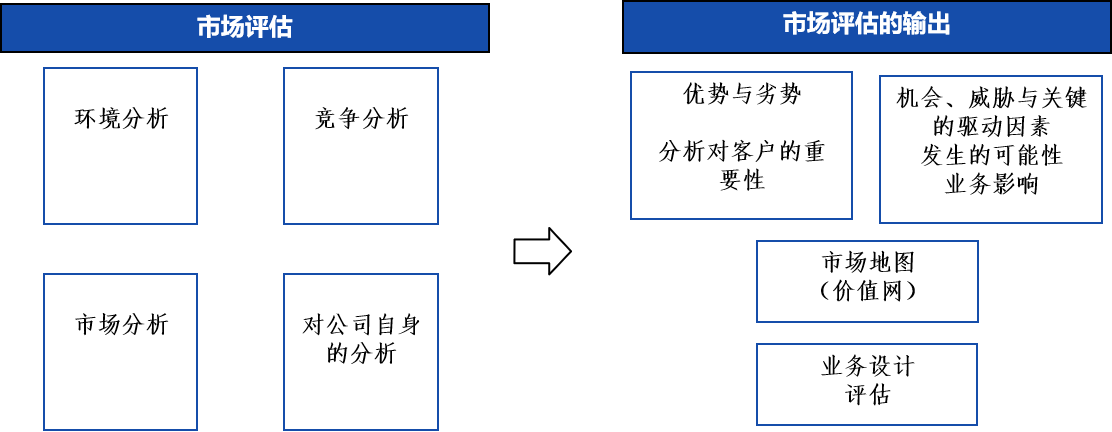市场分析包含市场评估及其输出两个部分,如下图所示: