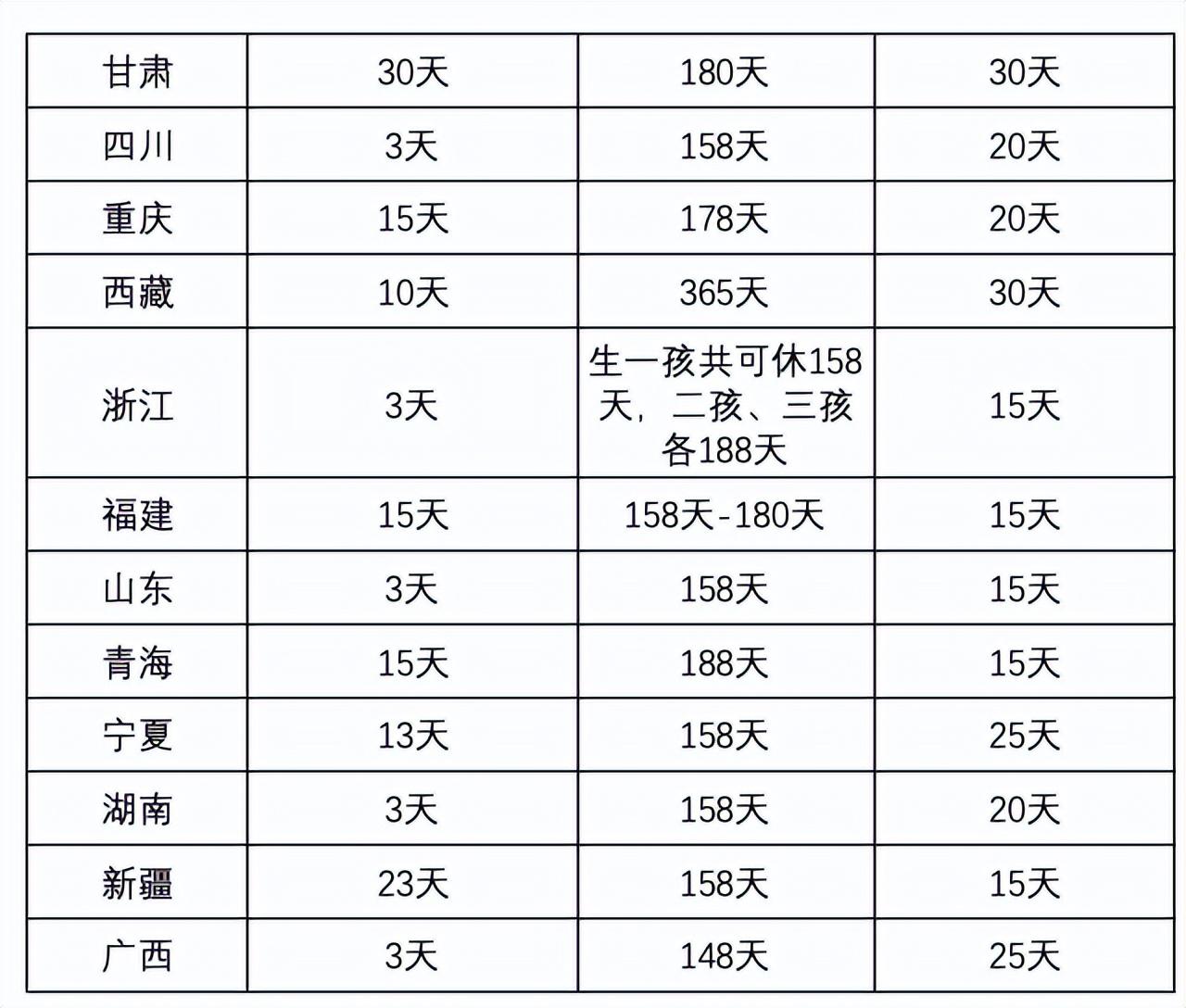 2021年各地逐渐修改《人口计划与生育条例》,增加了婚假&产假&陪产假的天数,具体可以查看下表: