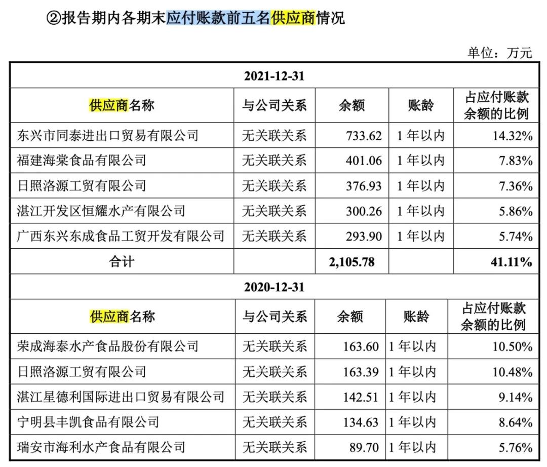 公司供应商中也很少有持续合作的,如2019年第三大供应商的合浦亿华水产品贸易有限公司,在当年空降第三后便退出后续供应商前五。更值得推敲的是,此公司在2018年9月才刚刚成立。