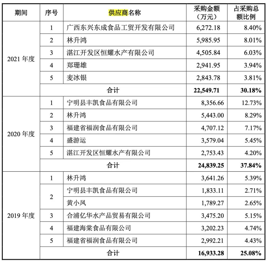 但纵观2018-2021年鲜美来的供应商,却存在诸多自然人的身影,且各期内对自然人供应商的采购金额都过千万。