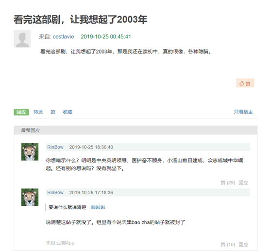 在国内互联网上,《切尔诺贝利》也引起了网友们的热议,豆瓣上建立了专门的影评小组,成员接近两万人。诸多豆瓣网友纷纷就该片对体制和人性深邃的反思进行热烈地讨论。有网友提到,“看完这部剧,让我想起了2003年”,还有网友说,“建议把我国核电站的城市都圈出来,恐怖……”,更有网友质疑,“能不能科普下,女科学家(乌拉娜·霍缪克,剧中虚构人物)为什么被捕?”