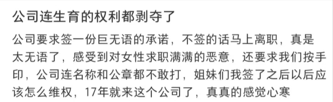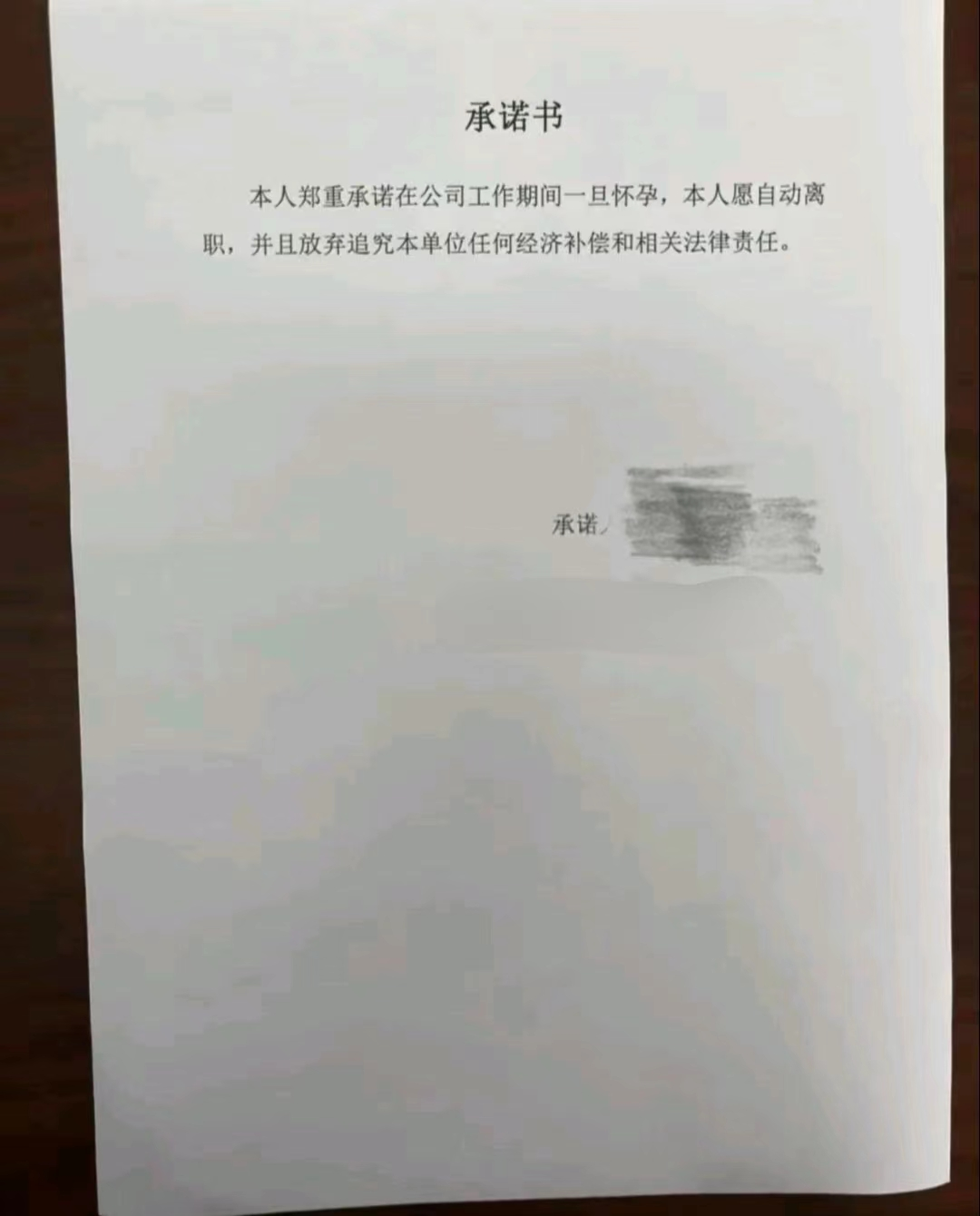 起初是有家公司的女员工发布了一个帖子,帖子的内容引起了众人关注,这家公司竟然让女员工签署怀孕即离职的承诺书。