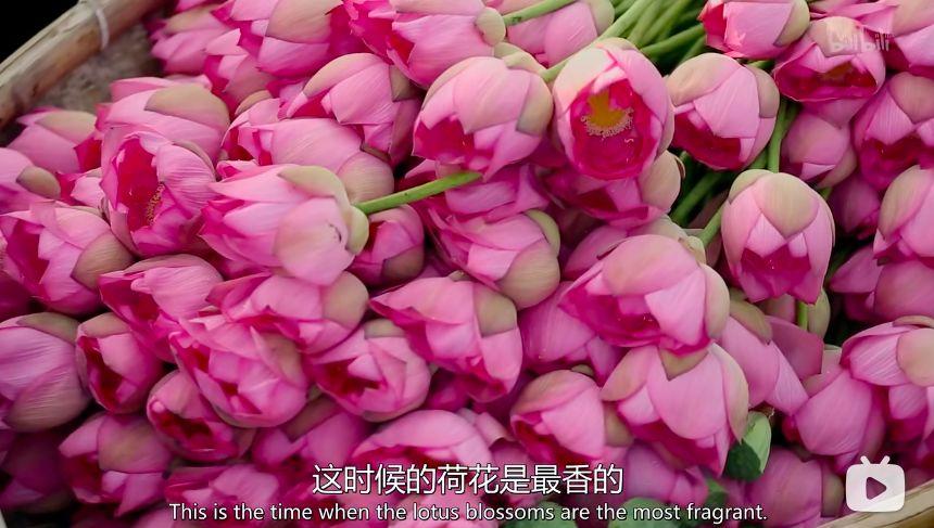 荷叶田田。荷花会在第一天绽放一个小口,闭合之后再开放,最佳的采摘时间是每天早上5到7点。船夫们老练地用着五米长的竹蒿划船穿过繁密的荷叶,摘下还未完全绽放的荷花。附近的人们簇拥到码头,将最新鲜的荷花捧回家。