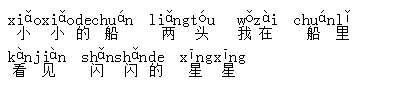 学习第三、四行诗:我在小小的船里坐,只看见闪闪的星星蓝蓝的天。