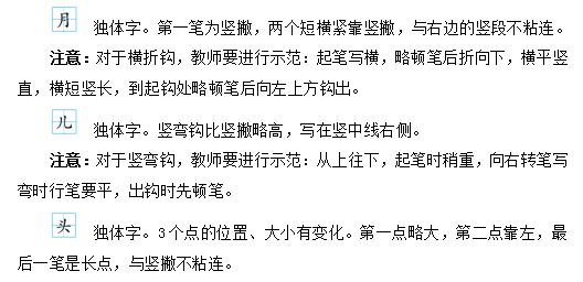 提示:在书写时,引导学生发现“月、儿、头”3个字撇的同异:“月、儿”的撇同为竖撇,要写得正一些,“头”的撇要写得斜一些,不过它们都要写得修长、舒展。