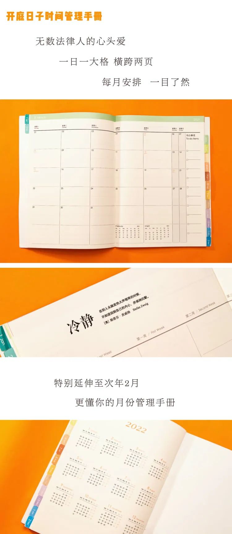 一句话推荐:专属于法律人的时间管理手册。封面设计精美,颜值秒杀常见日程本,100克纯质纸内页书写超顺滑,月度规划、周规划、日规划皆有周到考虑,特别延伸至次年2月,并有每月警句格言为你提气凝神,为案头增添书香之气。