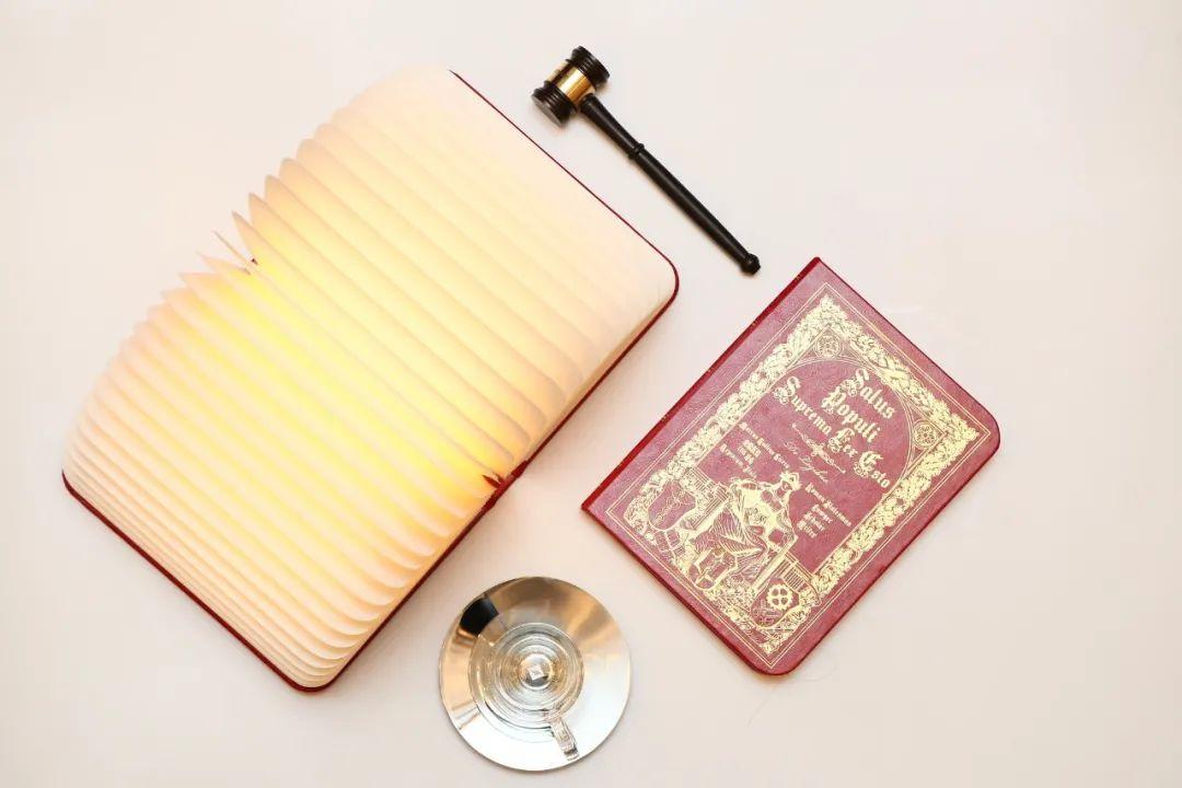一句话推荐:法律人的文艺之光,开可照明,合则为书,可用于加班陪伴、床头阅读、空间氛围、书架装饰等诸多场景;封面图案,来自德国民法典古本:蒙眼正义女神手持天平,倚靠法典,端坐于三大法律图腾盾牌正中;封面文字,来自古罗马著名法学家西塞罗《论法律》「Salus Populi Suprema Lex Esto」,意为「人民之安宁应是最高之法律」。
