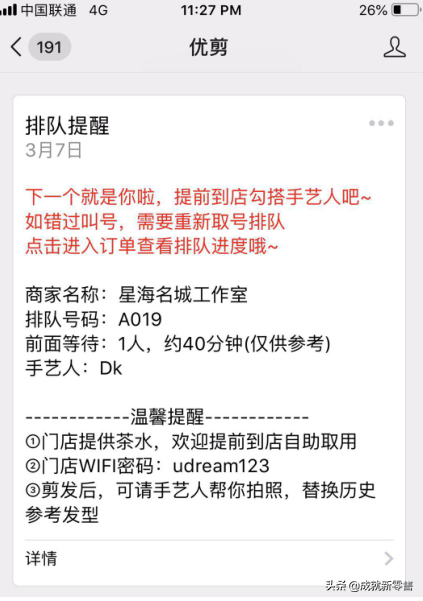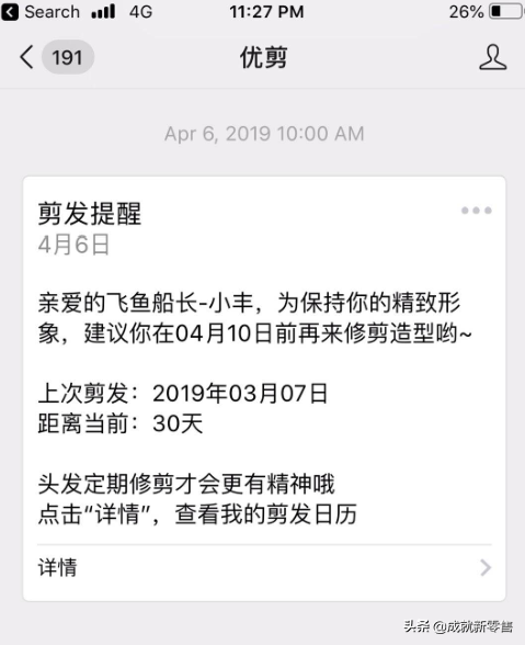 优剪:剪发是周期性的护理,每个月都会有需求。优剪管理顾客、唤醒沉睡顾客的做法是,在微信内提醒:距离上次剪发30天了,提醒顾客该到店剪发了,并具体到告知剪发时间。