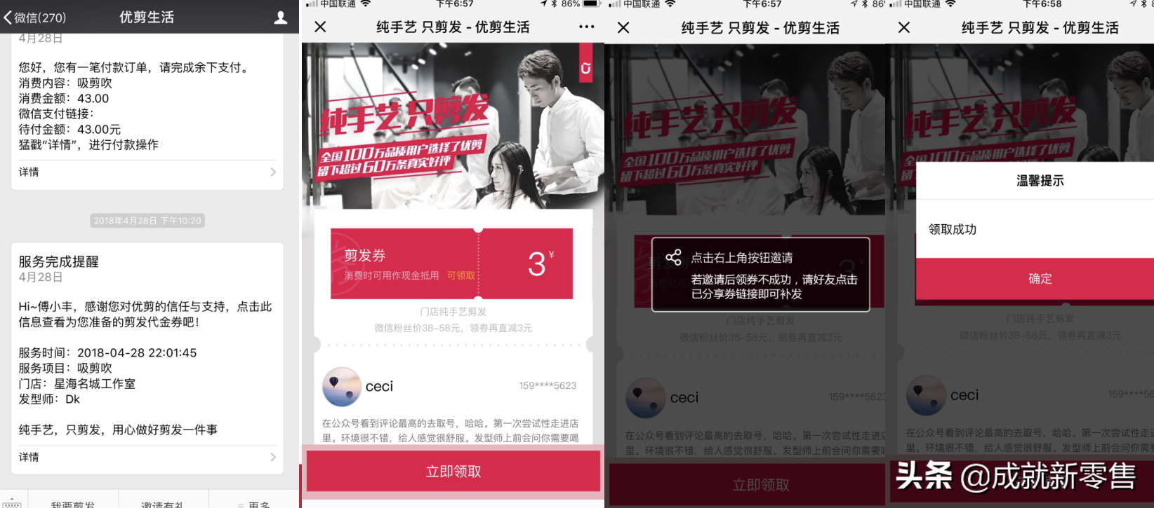 优剪:开通了微信公众号、小程序,方便服务顾客和管理顾客。由于本身产品服务好,就容易在公众号和小程序内沉淀历史用户评价,获得转化。此外,顾客邀请用户可获得优惠券,提升获取用户的效率。