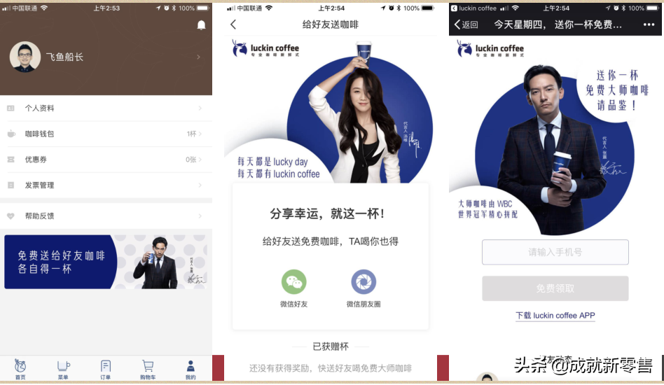 瑞幸咖啡:在楼宇和微信朋友投放“首杯免费”的广告,再分享朋友各得一杯,实现流量裂变(如下图)。