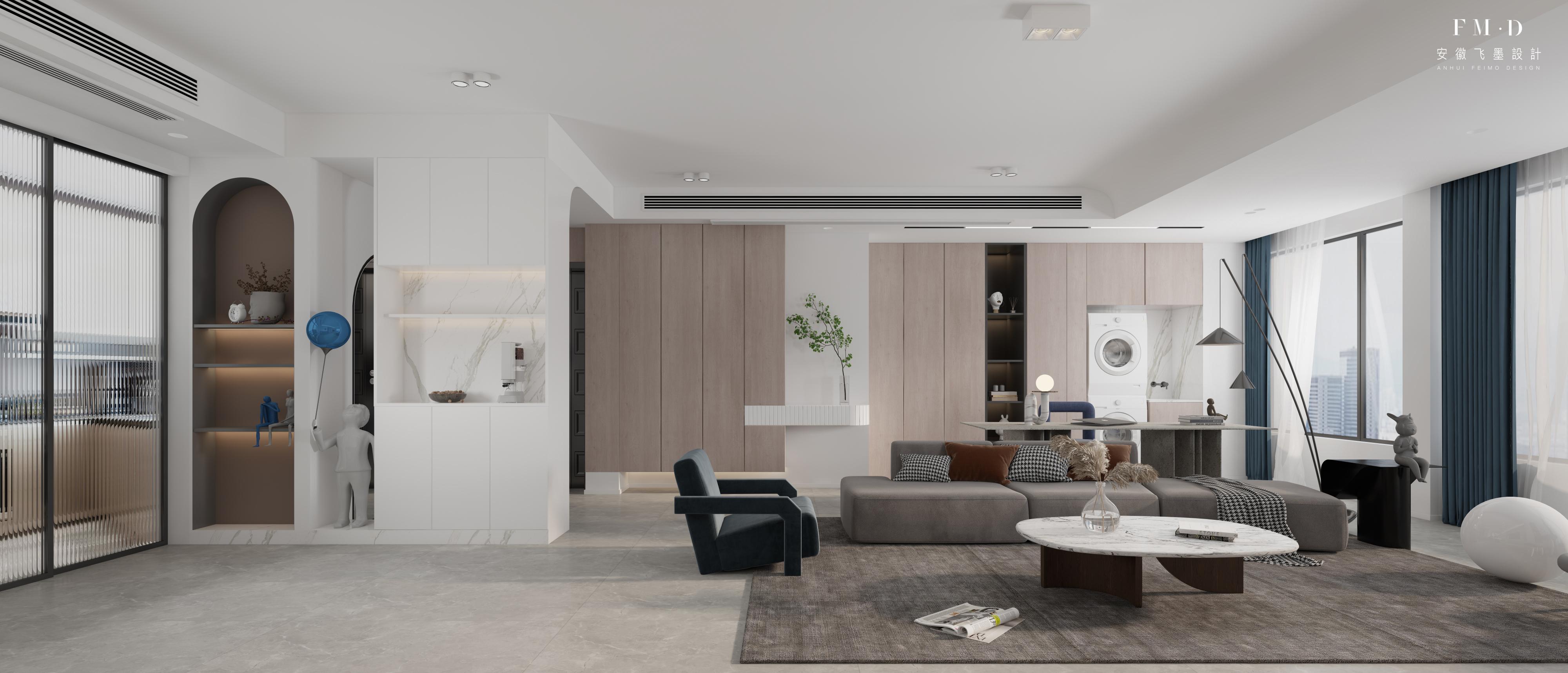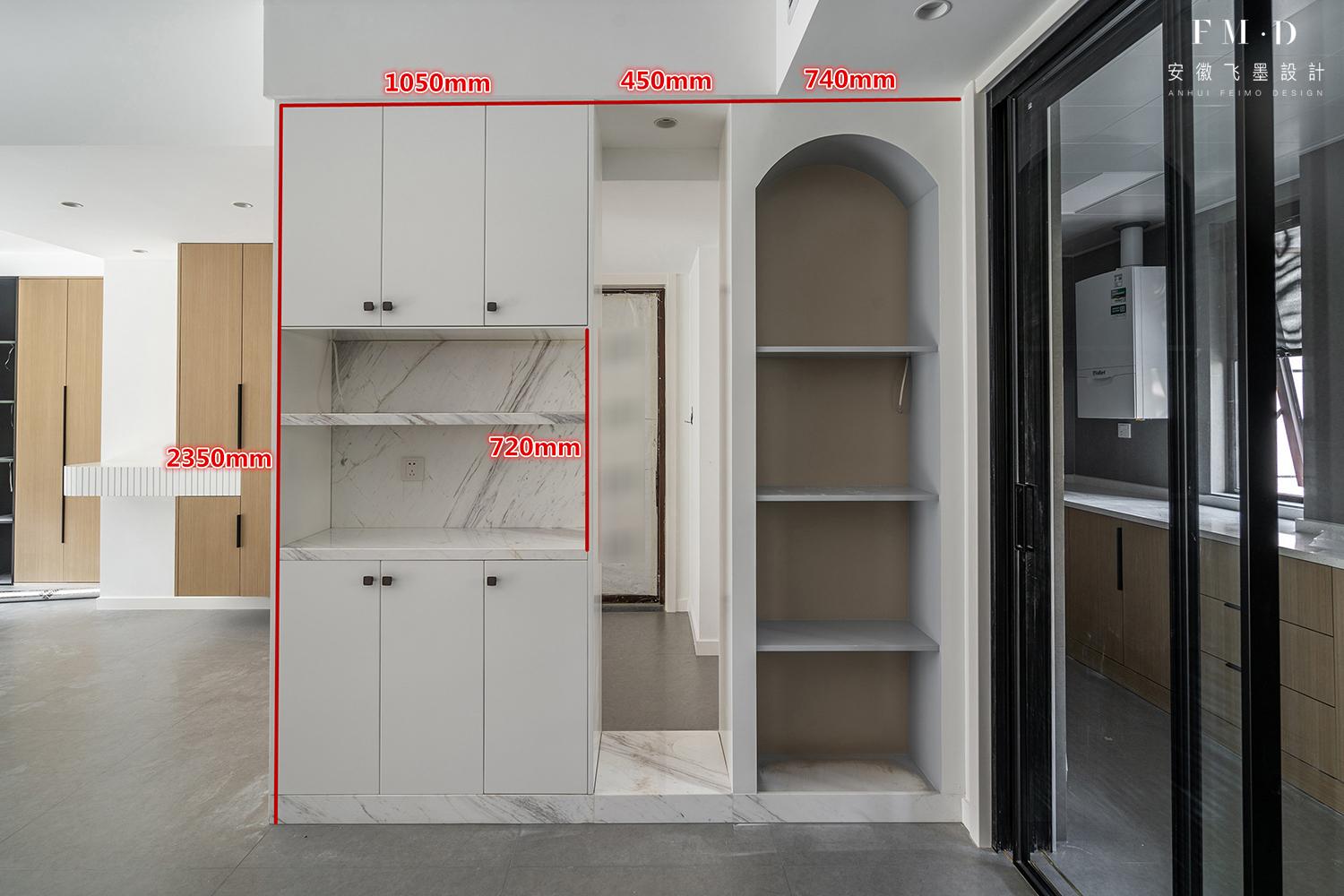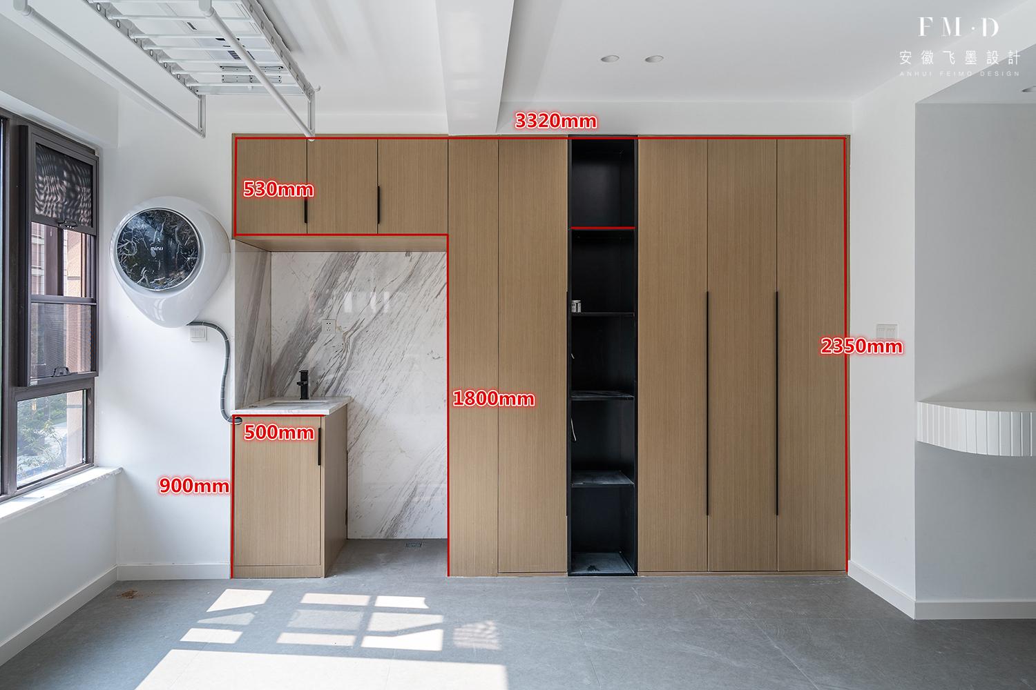 客厅里的整面墙的储物柜,后期沙发不靠墙,这儿可以作为开放式书房,这些柜子就能当书柜使用。最左侧原本阳台的位置还是保留生活功能,预留洗衣机烘干机位置,有洗衣池,墙上还有迷你壁挂洗衣机,洗洗小衣服或孩子的衣服都方便。