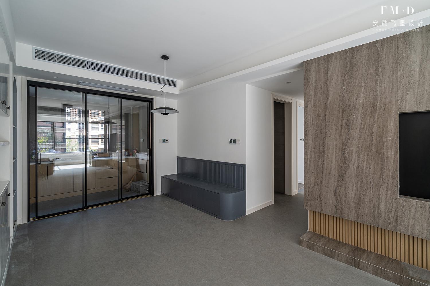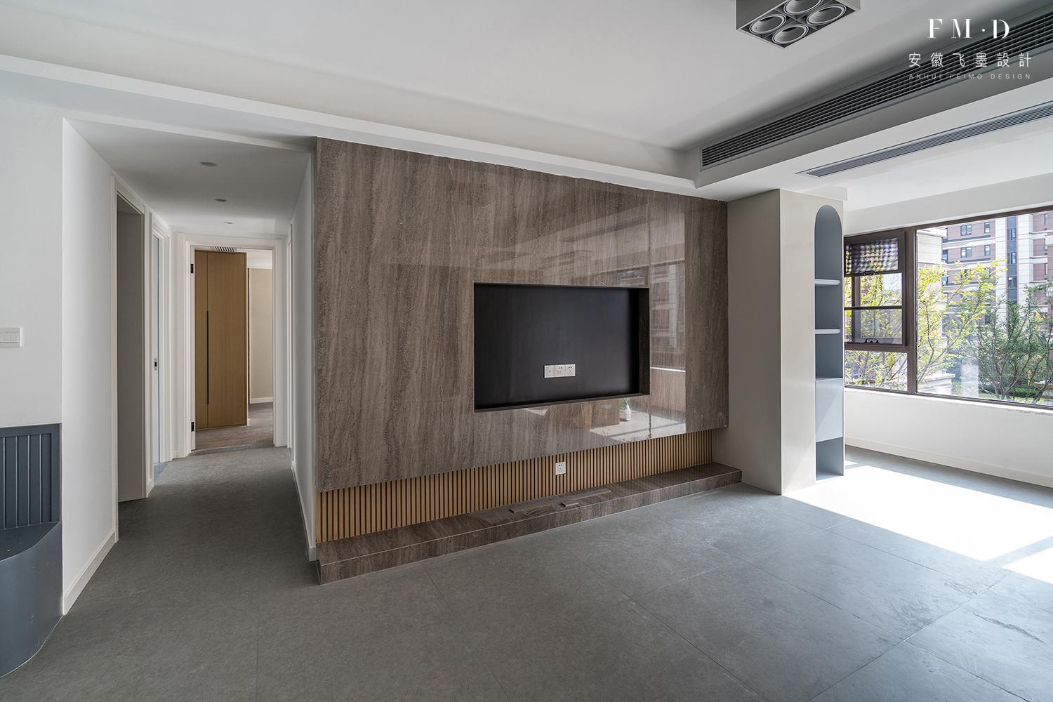 电视背景墙没有多余的装饰,岩板挂在墙上,中间嵌入电视,底部不要设计到底,预留空间设计地台,视觉上更有轻盈感。