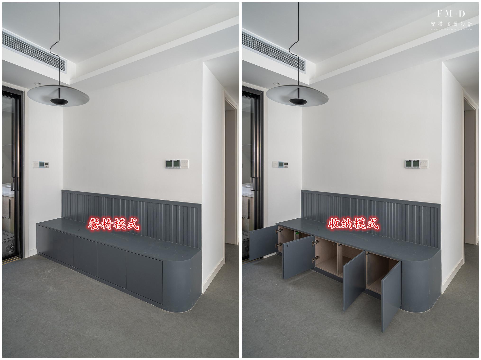 餐厅位置在厨房门口,中间玻璃做隔断更显通透感,卡座设计能同时拥有储物和餐椅两种模式,边角特地做了弧形处理。