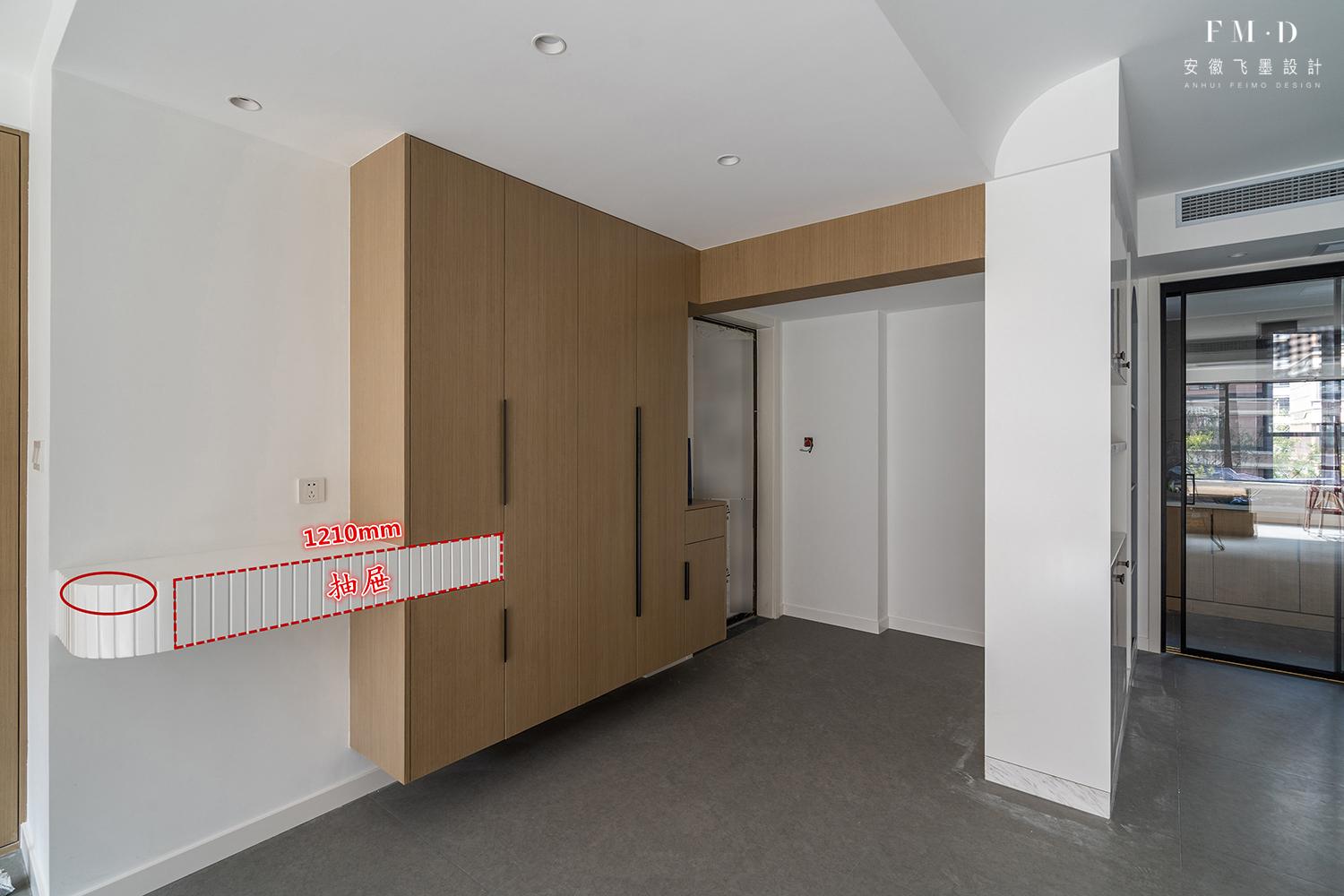 作为一个大横厅,除了要有高颜值且舒适的软装家具,充足的收纳空间也不能少,敲掉玄关跟客厅之间的隔断,玄关柜紧靠墙壁来设计,右侧小台面回家随手放钥匙,口罩,左侧抽屉可以将一些常带出门的小物件放在里面,预留插座方便给手机充电或后期添置其他电器。