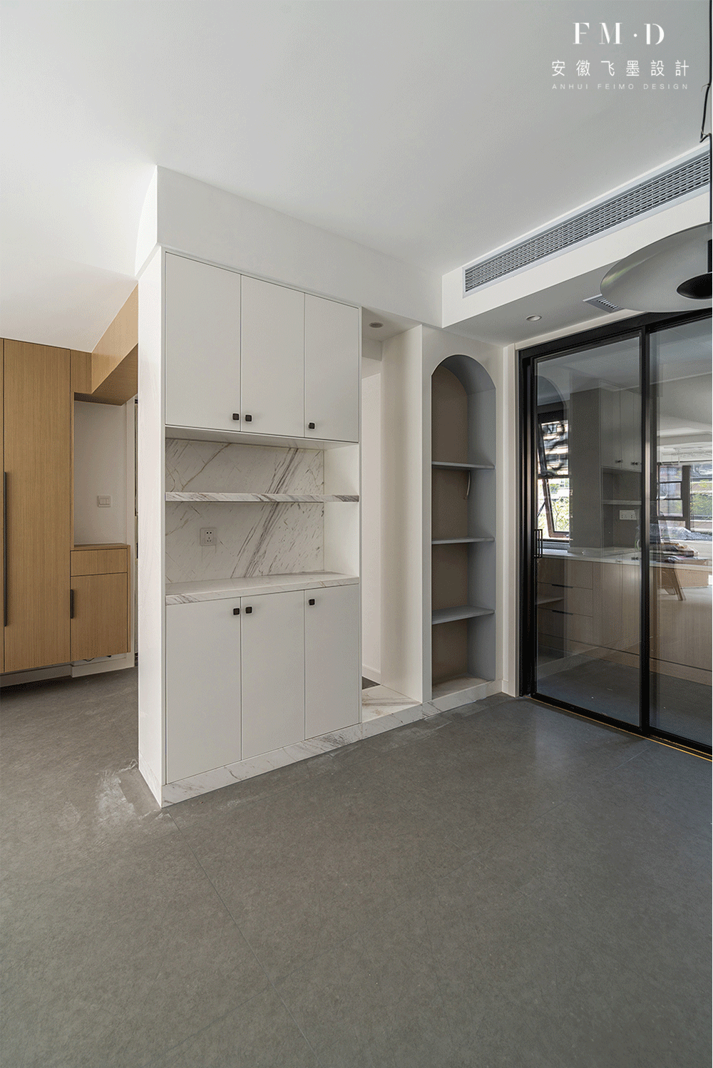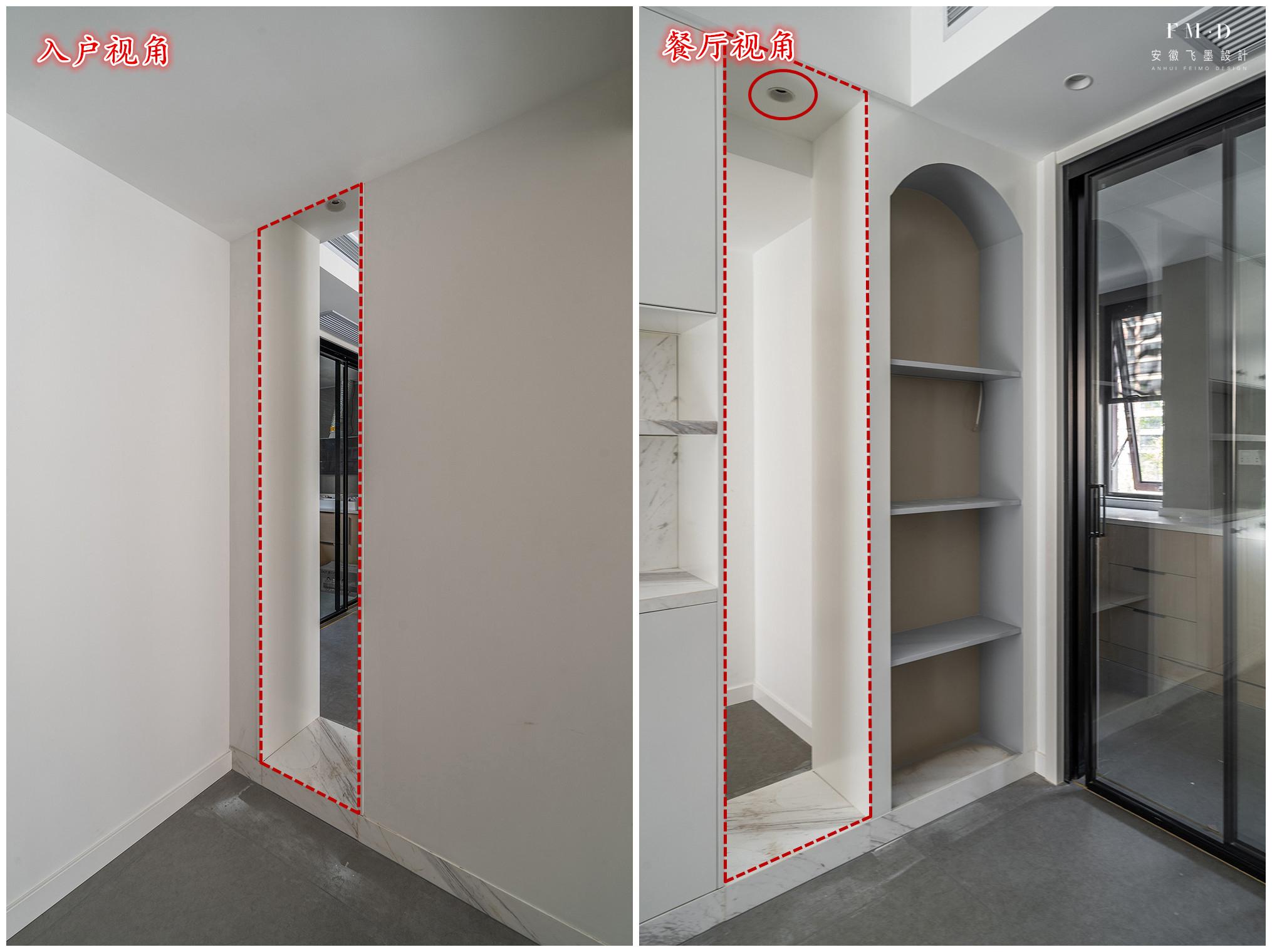 这家原本入户处有些缺点,比如入户门正对餐厅;右侧隔断挡住光线,入户光线昏暗。最好的方式就是将隔断敲掉连接客厅,光线自然不用愁,另外在入户门跟餐厅直接设计柜子,作为隔断,一来缓解了尴尬,二来也有了餐边柜来增加收纳。