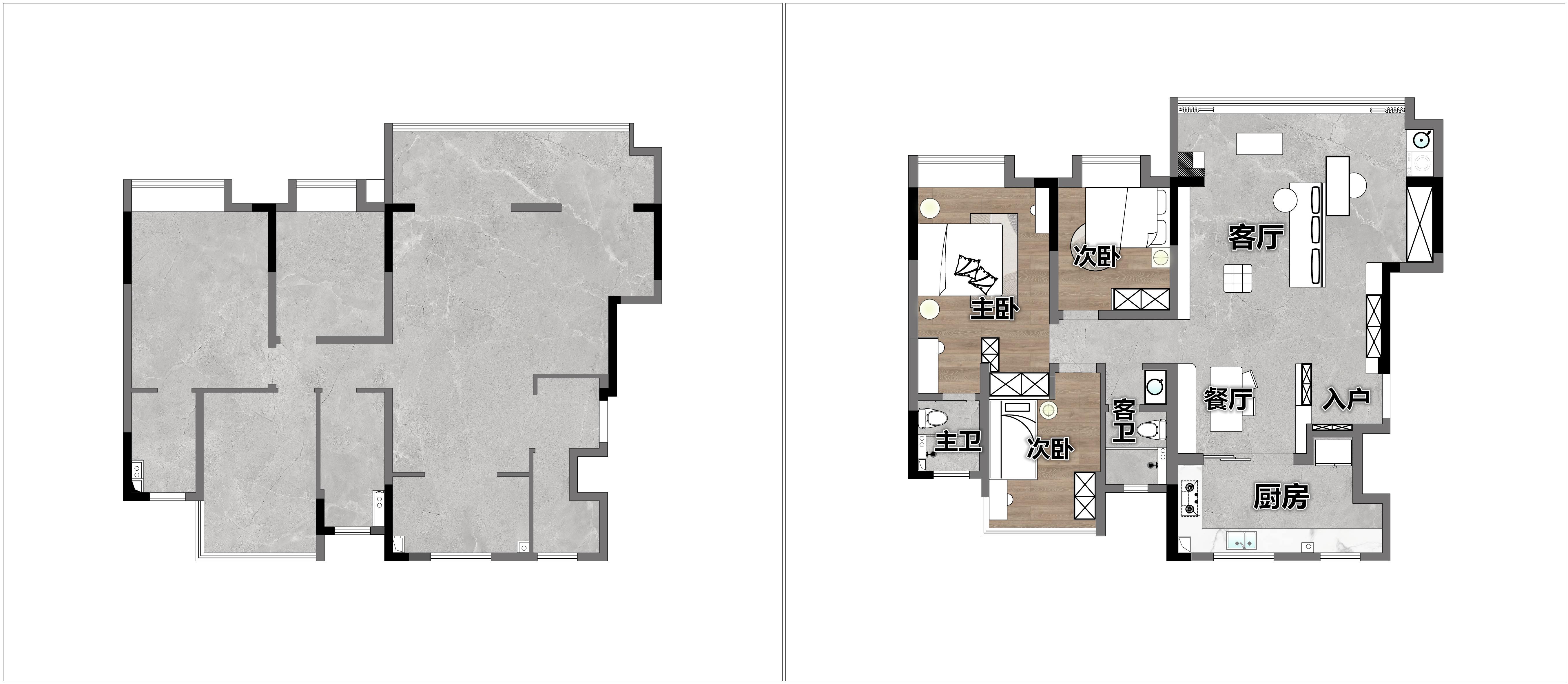 主卫和客卫都将洗漱台外移,内部淋浴房和马桶再隔开,实现真正的三式分离。