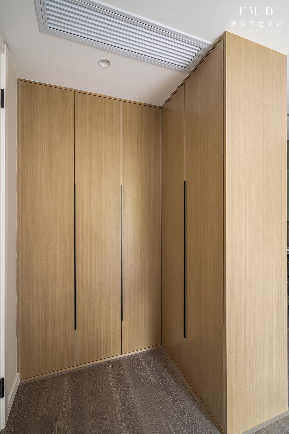 原本卧室门正对过道,私密性差,设计师在门口位置设计了L型衣柜,一来能挡着视线,遮住洗漱台,二来也拥有个小衣帽间。