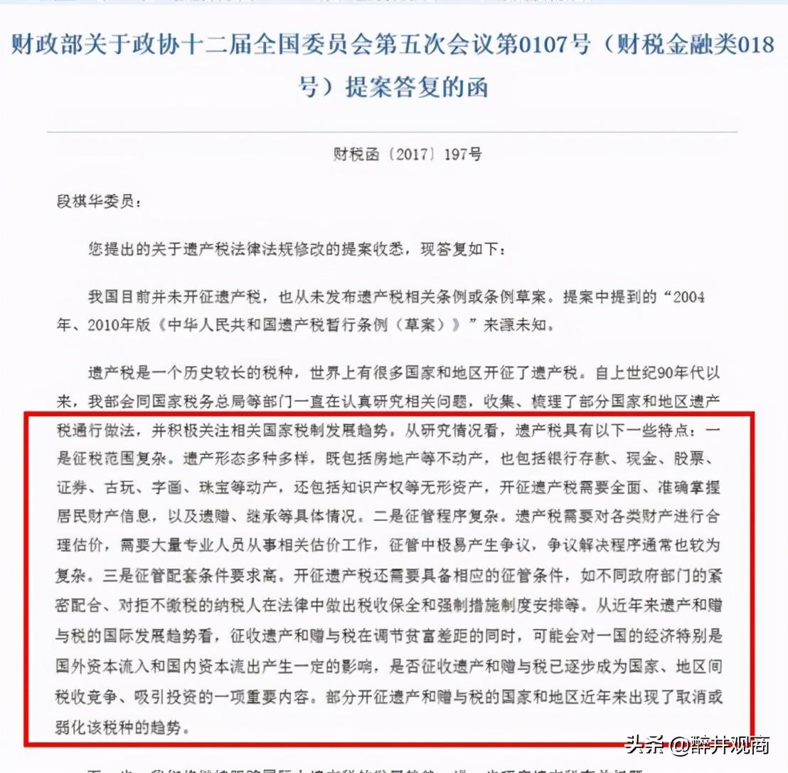 懂的人都知道,目前我国还没有征收遗产税的税种。在2017年的时候,财政部对于遗产税一些问题作了回复,可以见下图。