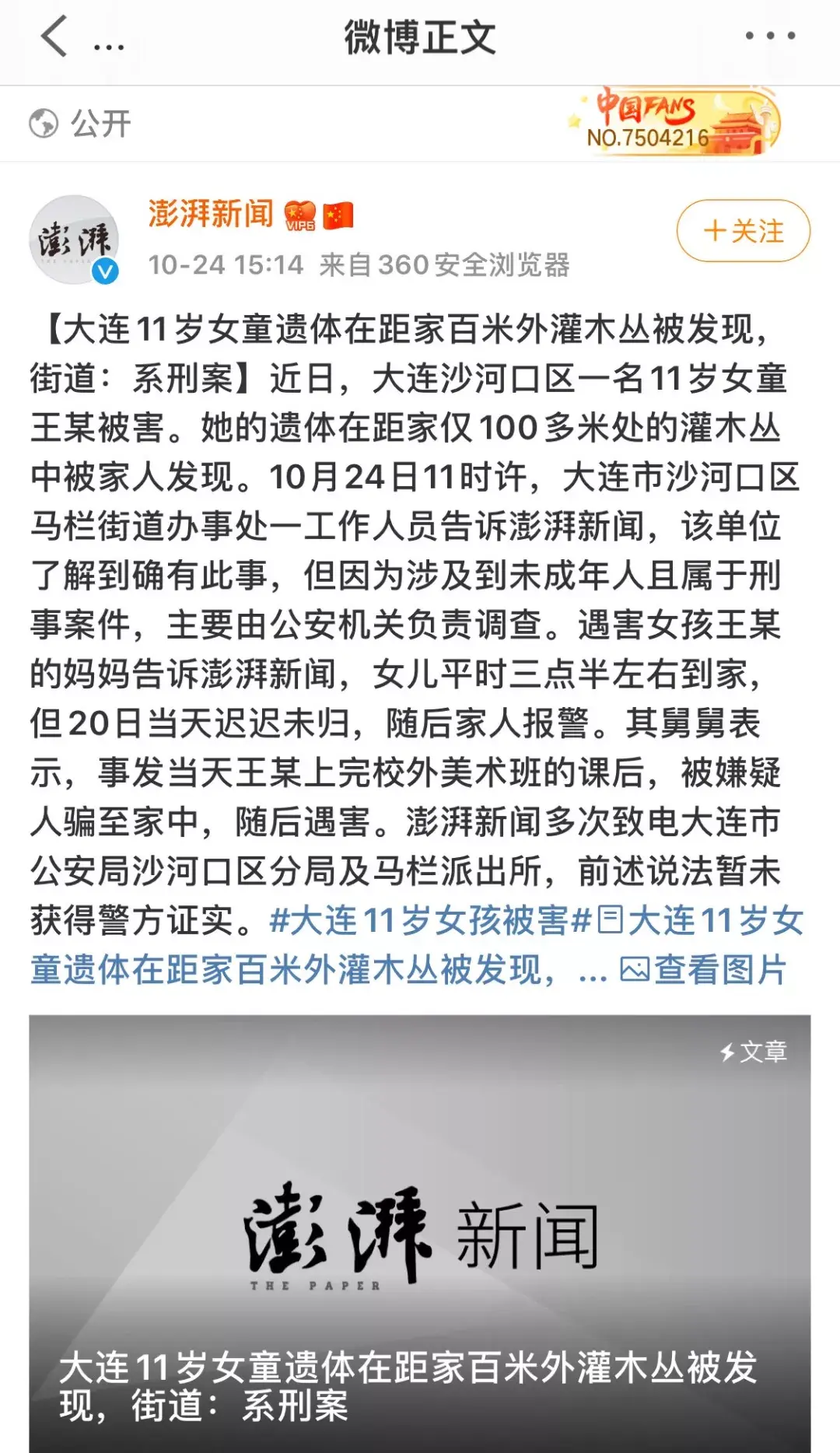 2019年10月20日,大连一名11岁的女孩遭到毒手,凶手是住在楼下的14岁的蔡某。