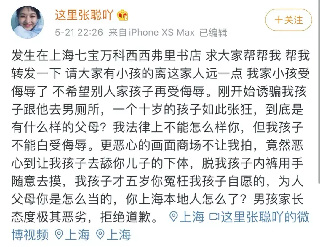 5月21日,微博博主“这里张聪吖”爆料,称邻居5岁的女儿在一家书店,被一个10岁男孩侮辱了。