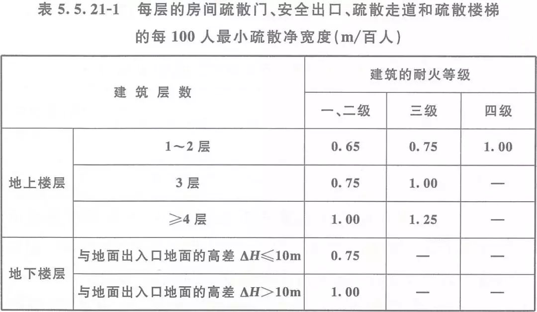 比如建筑高度为4层的二级耐火等级办公楼,在取值时一二层百人宽度指标取0.65 m/百人,三层百人宽度指标取0.75m/百人,四层百人宽度指标取1.00 m/百人,这种取法是错误的。根据建规表5.5.21,表中给出的层数为建筑层数,这里指的是建筑总层数,所以4层的二级耐火等级办公楼每层的百人宽度指标都应该取1 m/百人。