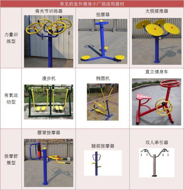 适宜老人运动的健身器材以轻量运动健身器械为主,可分为力量训练型、有氧运动型和按摩舒展型三类,可视场地组合搭配。