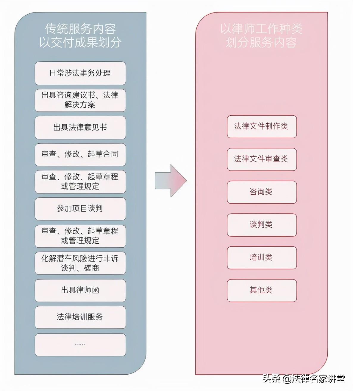 在律师表达服务内容时,传统的表述是按照最终交付客户的成果进行划分的(如审查合同、撰写法律意见书等),这是因为起初许多企业在聘请法律顾问时,会按照其自身的需求罗列需要服务的事项,而后这些分类就被许多律师沿用至今。可随着反馈方式的多样化,越来越多的法律服务产品被引入,这样的分类并不能对律师界定服务内容起到正向作用,还有可能因分类混乱,造成约定不明或难以界定的情况。