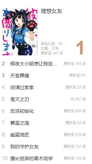 在漫画方面作为一部新漫画,无论是日本的销量还是我们国内的人气也是非常的高,在B站漫画中也是名列前茅。
